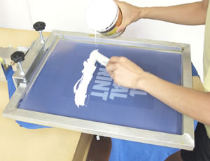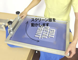 スクリーン版を一度上げ、デザイン原画を取り除いてからスクリーン版の上にインクを適量乗せます。