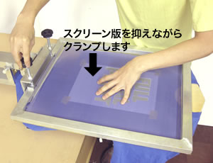 マッチングが完了しましたらスクリーン版がずれない様に片手で抑えクランプバーのネジを締めて、スクリーン版をクランプします。