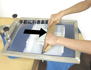 スキージを下方向に力を入れながら手前に引いてTシャツにインクを定着させます。